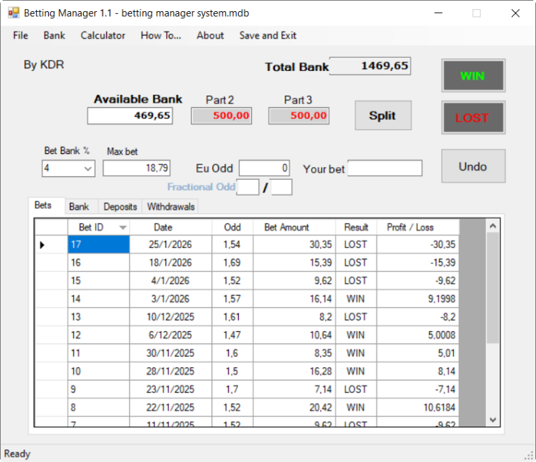 In the right image, the bankroll will be kept updated according to the results. Starting with 1500 units split into 3 parts, our target is to check the profitability of the system using the software.